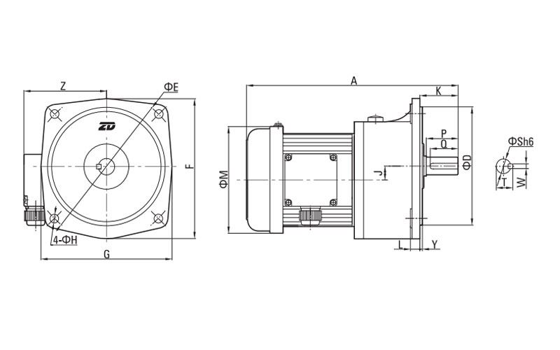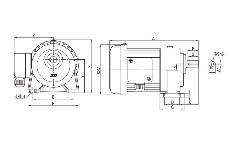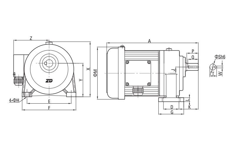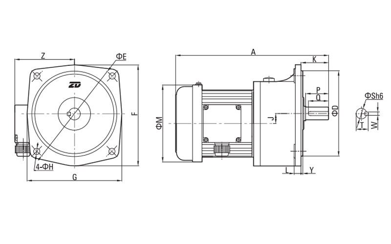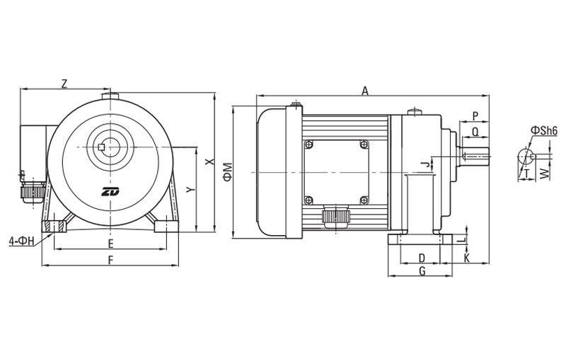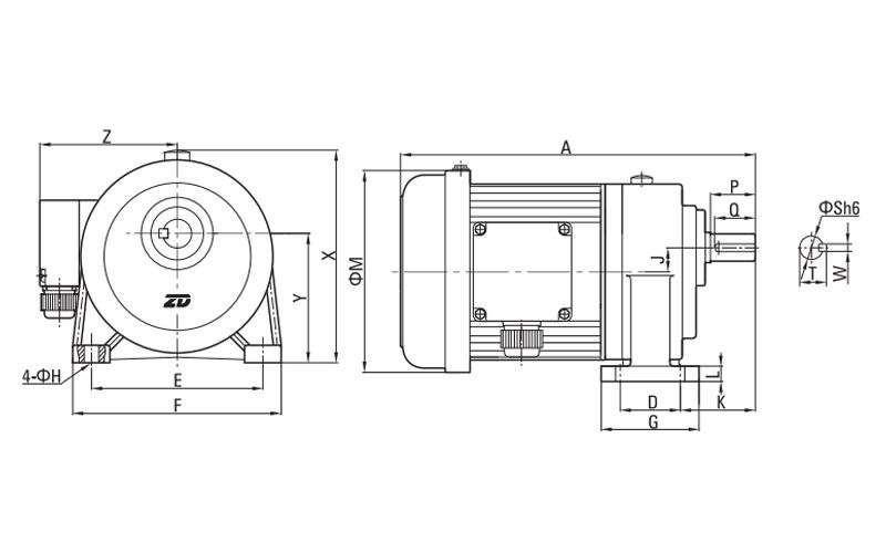 | Potencia | Relación de transmisión | A | D | E | F | G | H | J | K | L | M | X | Y | Z | S | P | Q | W | T | Peso |